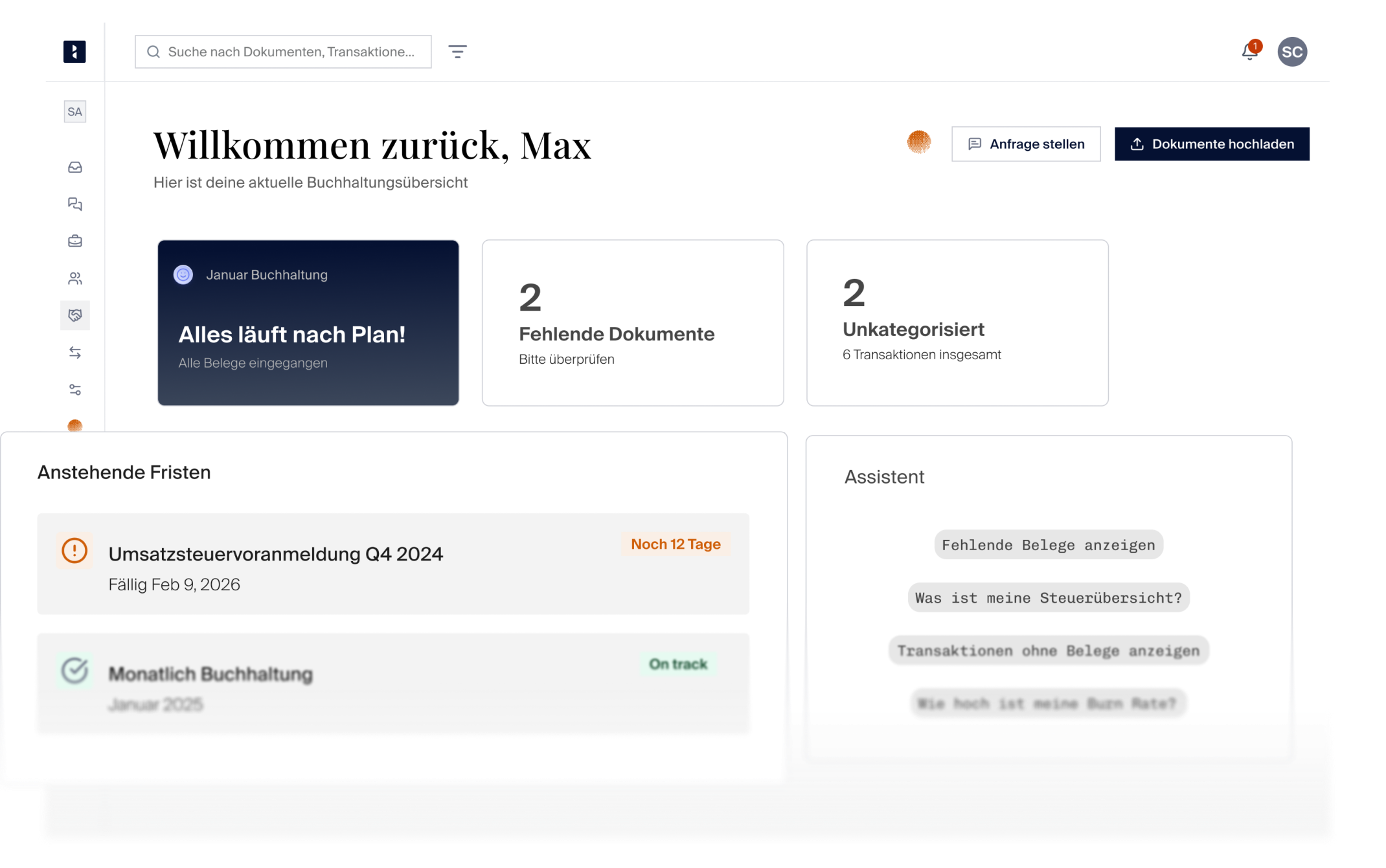 Sie erhalten frühzeitig eine Übersicht über fehlende Unterlagen, steuerliche Pflichten und anstehende Fristen.